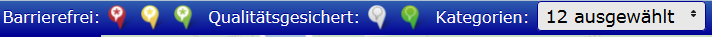 - „Barrierefrei“ und „Qualitätsgesichert“: Durch einen Klick auf die Symbole werden Ortspunkte dieser Klassifizierung nicht mehr angezeigt. Das Symbol wird heller dargestellt. Erneutes Klicken auf das Symbol hebt die Filterung auf.